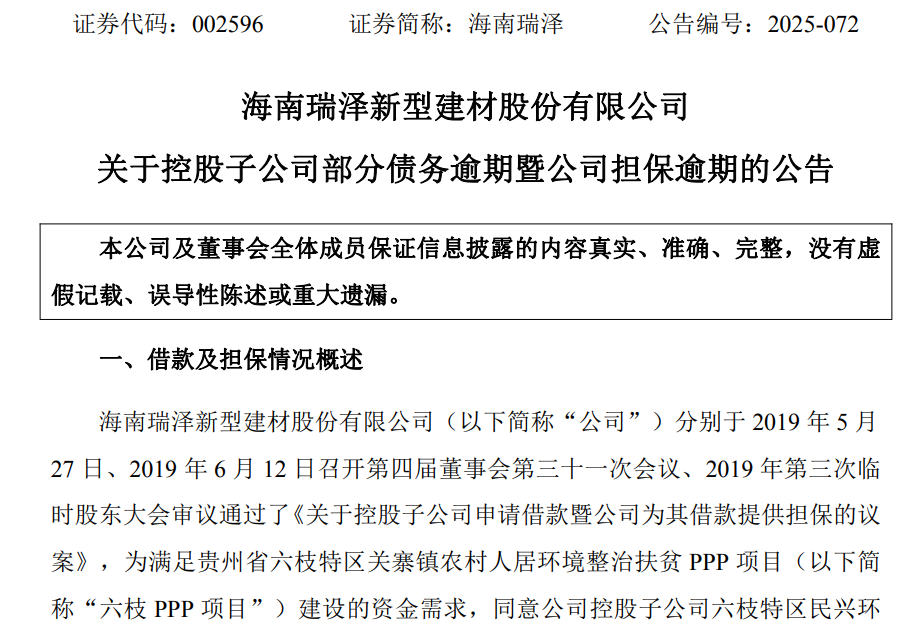 1月4日晚间,海南瑞泽(002596)发布关于控股子公司部分债务逾期暨公司担保逾期的公告。