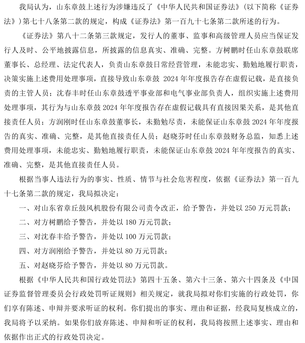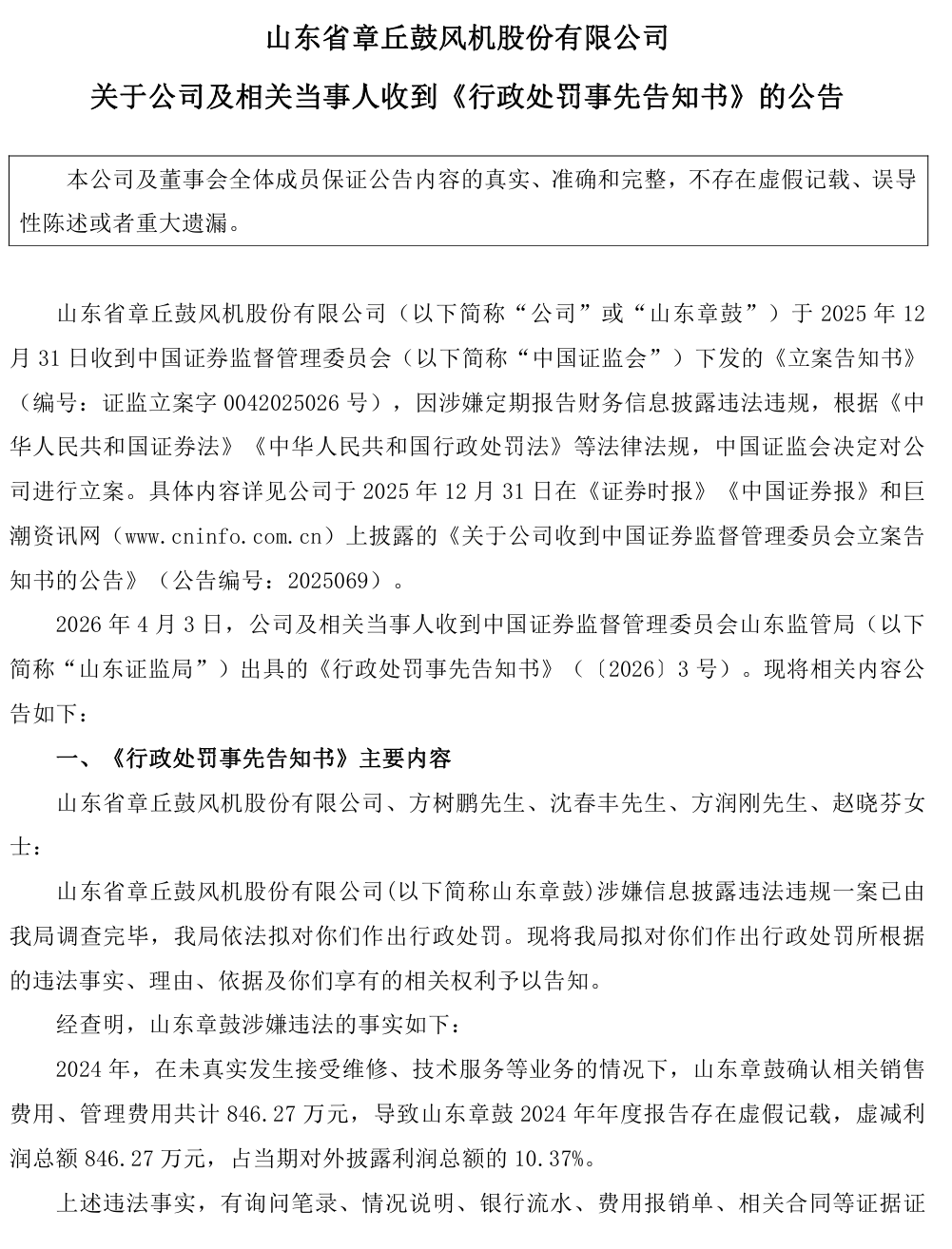 山东章鼓(002598.SZ)4月3日晚间公告,因公司涉嫌2024年年报存在虚假记载,山东证监局拟对公司及相关责任人合计罚款690万元。其中,方润刚、方树鹏父子合计拟被罚260万元。
