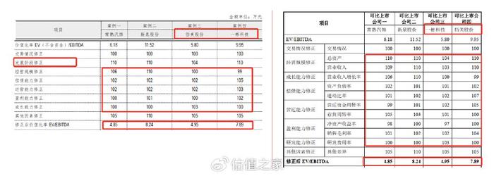 而市场法方面,资产评估报告中所披露价值比率测算表格还存在与重组报告书对应表格严重不一致的情况,也不得不令估值之家对于独立财务顾问、评估机构是否勤勉尽责与专业性,以及其测算结算的合理性颇为担忧。首先,在评估机构详细列示的修正比较因素中,我们并未查见其对发展阶段因素进行了修正,但在最终的EV/EBITDA价值比率测算表格中发展阶段修正因素却是赫然在列。其次,资产评估报告中经营规模、偿债能力、运营能力等数项修正指标测算数据也与重组报告书中对应数据并不匹配,但令人诧异的是两版修正后的EV/EBITDA数据却是完全一致。再次,更为离谱的是,即便两版修正后的EV/EBITDA数据完全一致,但所分别对应的可比公司却并不相同,资产评估报告岱美股份、一彬科技修正后的EV/EBITDA分别为4.95、7.89,而重组报告书中却是正好相反。