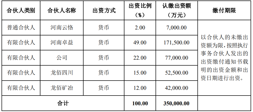 合伙企业总出资额为35亿元,其中河南云恪为普通合伙人,并担任合伙企业的执行事务合伙人和管理人,认缴出资额7000.00万元,出资比例为2%;河南卓益为有限合伙人,认缴出资额17.15亿元,出资比例为49%;龙佰集团为有限合伙人,认缴出资额7.7亿元,出资比例为22%;龙佰四川为有限合伙人,认缴出资额5.25亿元,出资比例为15%;龙佰矿冶为有限合伙人,认缴出资额4.2亿元,出资比例为12%。