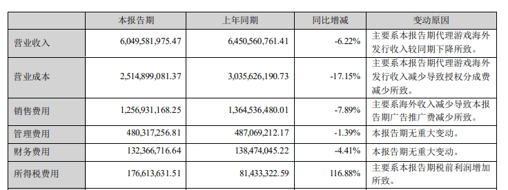 对于营业收入的下滑,世纪华通称主要系本报告期代理游戏海外发行收入较同期下降所致。