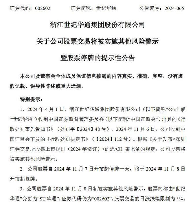 世纪华通11月6日还发布公告称,公司股票自2024年11月7日开市起停牌一天,将于2024年11月8日开市起复牌。公司股票自2024年11月8日起被实施其他风险警示,股票简称由“世纪华通”变更为“ST华通”,证券代码仍为“002602”,股票交易的日涨跌幅限制为5%。