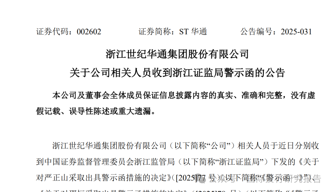 ST华通公告,公司7位高管同时收到深交所监管函、浙江证监局警示函,其中包括公司上市14年以来连续4任董秘。