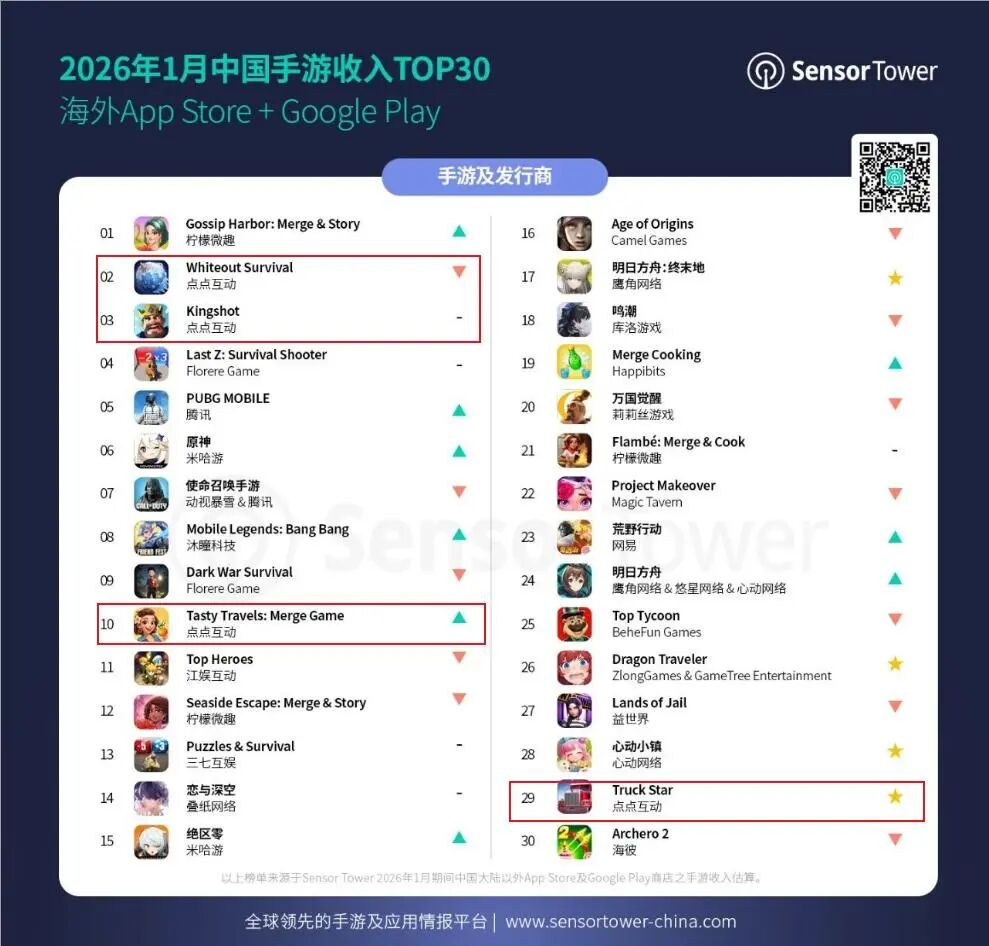 业绩增长的背后,公司业务布局海内外双线开花,其中出海为核心增长引擎,依托完全数据驱动型“研运发”体系,SLG品类产品《Whiteout Survival》跻身全球手游“10亿美元收入俱乐部”,且有多款产品登上中国手游出海收入榜前列,尤其是休闲游戏品类也实现了突破性发展;国内业务同样稳中有进,旗下点点互动多款产品稳居畅销榜,旗下盛趣游戏深耕长青IP运营,实现经典端游IP全面手游化,2025年业绩同比增长超30%。