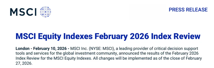 作为全球顶尖的指数编制机构,MSCI(明晟公司)是全球资本市场极具影响力的独立指数服务商,其编制的系列指数是全球机构投资者进行资产配置、价值研判的核心参考基准,更是全球被动型指数基金的重要跟踪标的,其指数调整动向始终牵动全球资本市场神经。今年2月份的季度调整公布了MSCI全球标准、MSCI全球小盘、MSCI全球微小盘等主要指数系列的新增、剔除名单。