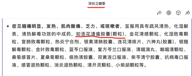 不过我倒是找到了深圳卫健委12月12日下午2点33分发布的一篇文章《权威中医药方来了!收藏》,其中的“治疗方案”中针对咽喉痛、发热、肌肉酸痛、乏力和咳嗽症状首先推荐的中医就是连花清瘟。这就说明深圳卫健委是认可连花清瘟在治疗新冠中的作用的,也明确是推荐给市民使用的,说明和国家卫健委是保持一致的,说明是有一定效果的。