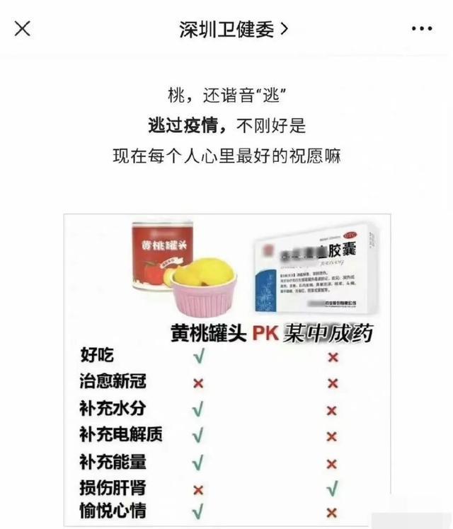 很快网上就流传出一张截图,是深圳卫健委微信公众号在“内涵”连花清瘟无效,深圳卫健委将连花清瘟和黄桃罐头做对比,黄桃罐头获得的“??”远多于连花清瘟,所以这张图片透露的信息就是深圳卫健委“内涵”连花清瘟无效,很多股民以及大V以此认为是导致以岭药业下跌的“元凶”。