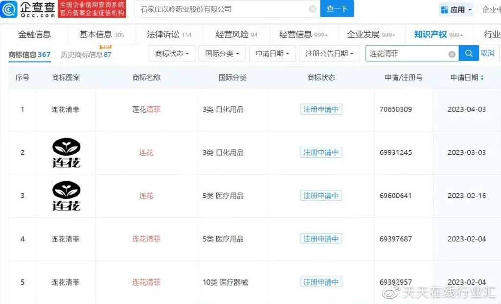 除了上述动作外,石家庄以岭药业股份有限公司近期还申请注册了多个“莲花清菲”、“连花清菲”商标,音同“清肺”,主打食品和日用品等,号称部分配方与连花清瘟药食同源,广告语中还包含“怕雾霾就喝连花清菲”等宣传语。目前在以岭药业的官旗上,在售多款“连花清菲”产品,包括润喉糖、饮料等,价格从15元-60元不等。
