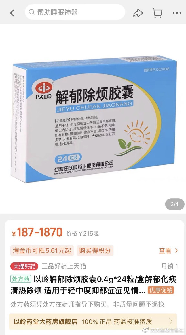 以岭大药房旗舰店销售的解郁除烦胶囊,售价为187元/盒(24粒),患者每天需服用三次,每次四粒,一个疗程为六周。也就是说,患者每天需花费93.5元,一个疗程药费3927元。有网友对此吐槽,称盐酸氟西汀胶囊(抑郁症患者广泛使用的药物)每天花不到一块钱。