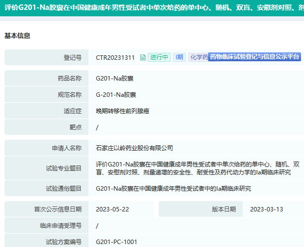 据药融云数据库,以岭药业1类化药新药G201-Na胶囊启动其在中国健康成年男性受试者中的Ia期临床研究。
