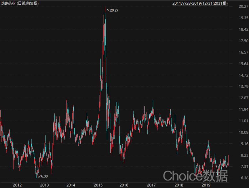 从2011年7月上市至疫情前(截至2019年12月31日),8年多的时间里,以岭药业股价除了2015年泡沫市中跟着大集体“嗨”了一把,其余时间都不温不火。这些年,公司股价累计不仅没有上涨,反而下跌了2.58%。