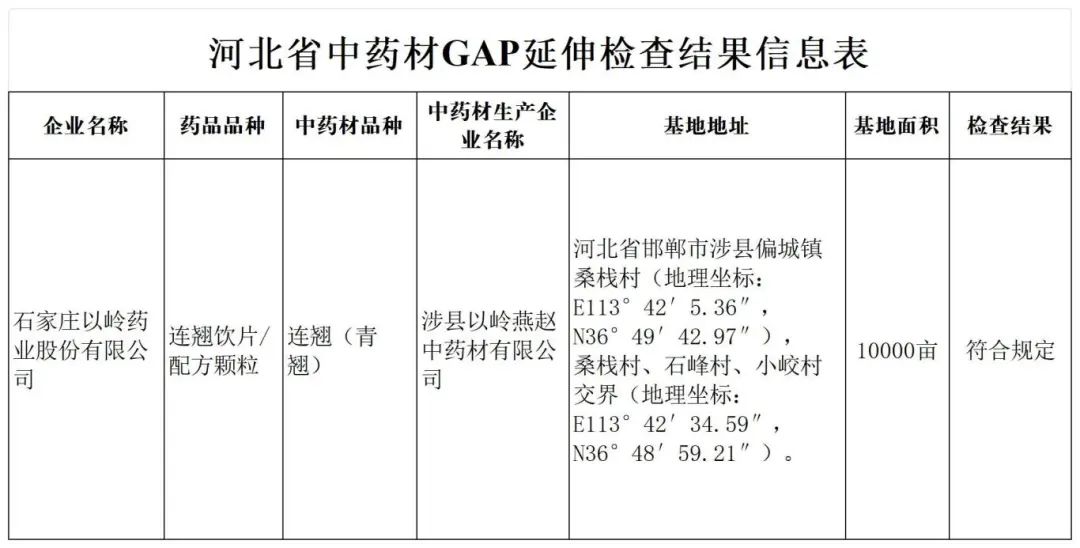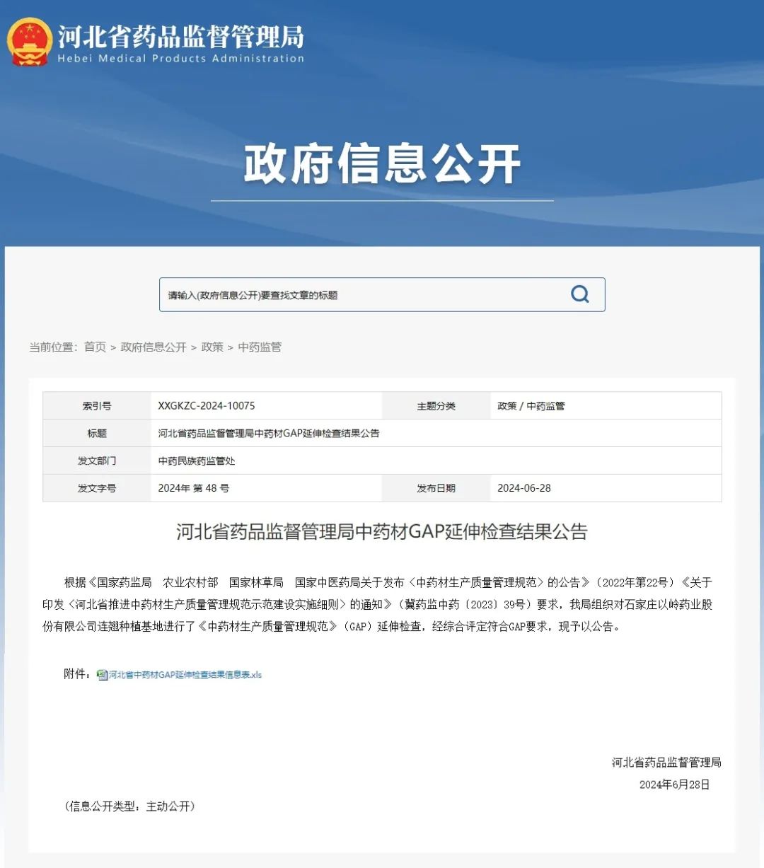 为进一步推进《中药材生产质量管理规范》(以下简称“中药材GAP”)有序实施,促进中药材规范化生产,加强中药材质量控制,推动中药高质量发展,河北省药品监督管理局会同省农业农村厅、省林业和草原局、省中医药管理局等部门对石家庄以岭药业股份有限公司连翘种植基地进行了GAP延伸检查,对检查结果进行综合评定,认为该基地符合中药材GAP要求,并于日前发布河北省中药材GAP延伸检查结果公告,标志着以岭药业连翘种植基地成为河北省首个通过中药材GAP延伸检查基地。