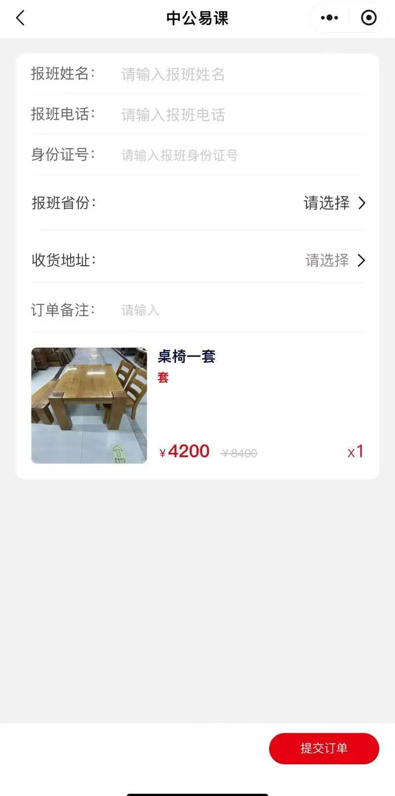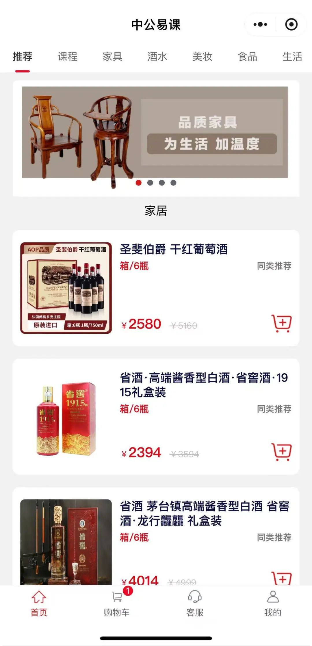 以物抵债的物品都有哪些?客服发给学员以物抵债的小程序名为“中公易课”,打开后为一个线上商城,商城中并没有看到常用的二手办公用品,而是显示有酒水、美妆、食品、生活、家具等频道。物品有干红葡萄酒售价2580元/箱,某白酒5394元/箱,茶具1988元/套,野山参礼盒2880元,多套二手收藏木质家具,比如木质沙发五件套19800元,以及价格几百元的PPT等办公软件教程。