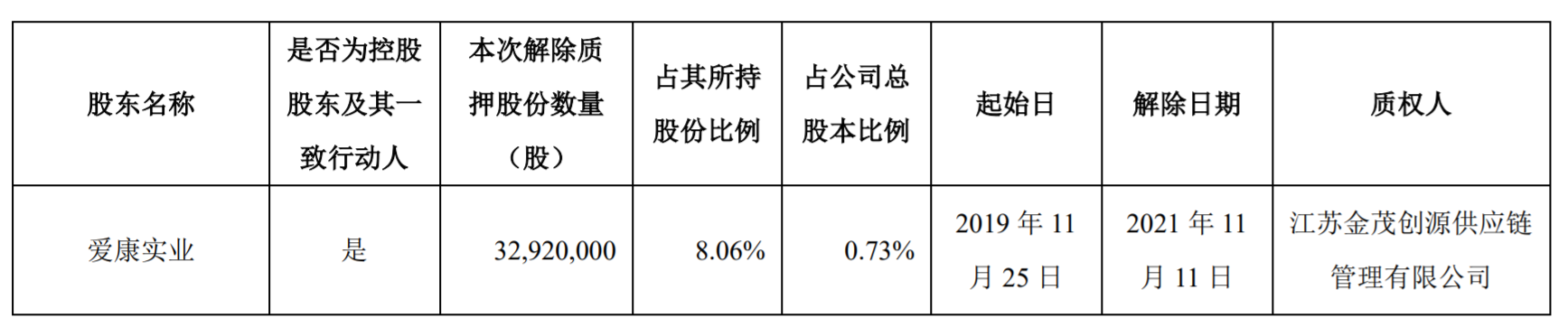 月12日,江苏爱康科技股份有限公司(以下简称“爱康科技”)发布关于控股股东解除部分股权质押的公告。
