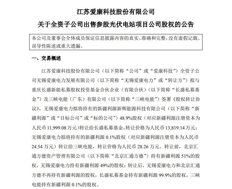 公告称,爱康科技全资子公司无锡爱康电力发展有限公司(以下简称“无锡爱康电力”)将持有的新疆利源新辉能源科技有限公司(以下简称“新疆利源”)48.9%股权转让给长盛私募基金,转让价格为人民币13,819.14万元;无锡爱康电力拟将持有的新疆利源 0.1%股权转让给三峡电能,转让价格为人民币28.26万元。转让后,长盛私募基金持有新疆利源99.9%的股权,三峡电能持有新疆利源0.1%的股权。