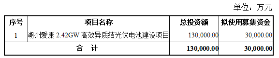 当日晚间,爱康科技同时发布公告称,拟定增募资不超过3亿元,用于湖州爱康2.42GW高效异质结光伏电池(HJT)建设项目。