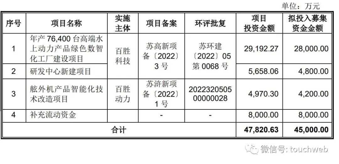 百胜动力计划募资4.78亿元,其中,2.8亿元用于年产 76,400 台高端水上动力产品绿色数智化工厂建设项目,4800万元用于研发中心新建项目,4200万元用于舷外机产品智能化技术改造项目,8000万用于补充流动资金。