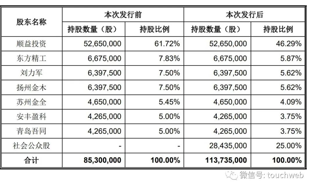 IPO前,顺益投资持股61.72%,东方精工持股为7.83%,刘力军、扬州金木分别持股7.5%,苏州金全持股5.45%,安丰盈科、青岛吾同分别持股为5%。