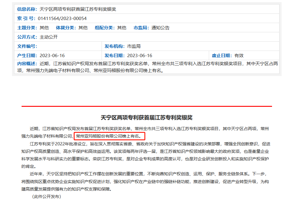 近年来亚玛顿在知识产权领域先后荣获国家级知识产权示范企业,江苏省首届专利奖银奖,一次荣获江苏省知识产权战略推进计划项目立项。此次再度拟获2023省知识产权战略推进计划立项,是对亚玛顿知识产权实力的认可,也是对亚玛顿科技创新能力的肯定。