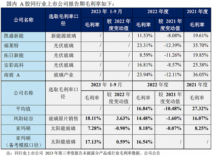 另外,亚玛顿还宣称:“由于行业内原片供应商陆续进入深加工行业,同行业上市公司中,除亚玛顿需通过外购光伏玻璃原片进行玻璃深加工外,其余上市公司均拥有光伏玻璃原片及镀膜钢化深加工产能,毛利率为光伏玻璃原片生产环节与深加工环节的综合结果,与凤阳硅谷毛利率不具有可比性。”