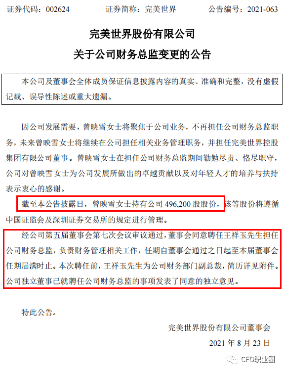完美世界8月24日发布《关于公司财务总监变更的公告》显示,因公司发展需要,原财务总监曾映雪女士将聚焦于公司业务,不再担任公司财务总监职务,董事会同意聘任王祥玉先生担任公司财务总监,负责财务管理相关工作。