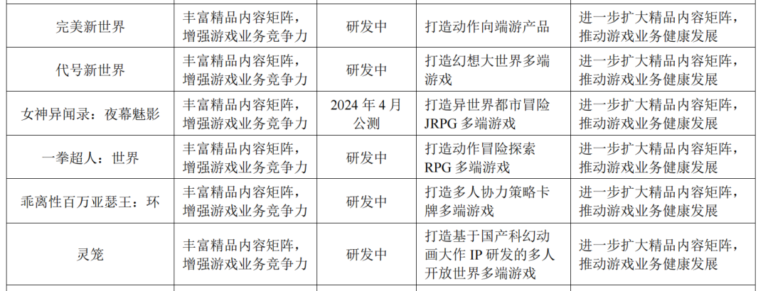 1.公司在报告期内审慎决定关停项目《完美新世界(Perfect New World)》《灵笼》《代号Lucking》《代号新世界》等,并相应进行人员优化,合计亏损约4亿元。
