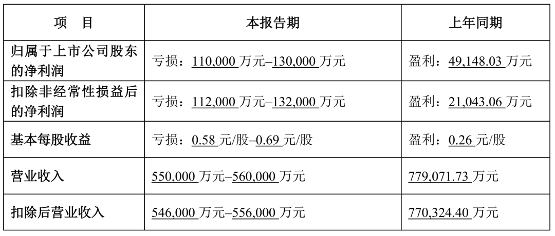 报告显示,公司本年度归母净利润预计亏损11亿-13亿元,同比转盈为亏;收入预计为55亿-56亿元,同比有所下滑。