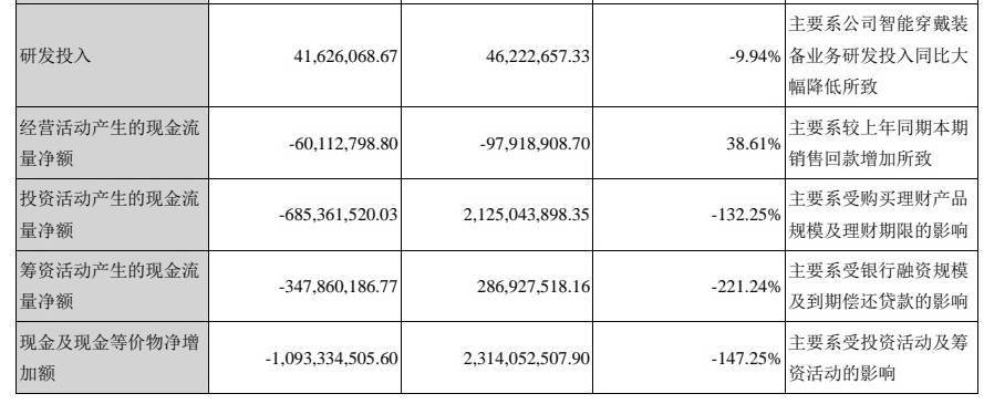 报告期内,光启技术的投资活动产生的现金流净额为-6.85亿元,同比下降132.25%。对此,光启技术称投资活动产生的现金流量净额减少主要系受购买理财产品规模及理财期限的影响。