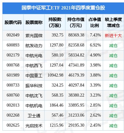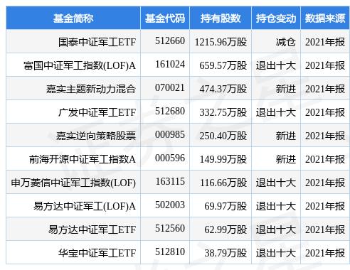 根据2021年报基金重仓股数据,重仓该股的基金共59家,其中持有数量最多的基金为国泰中证军工ETF。国泰中证军工ETF目前规模为118.98亿元,最新净值1.143(3月22日),较上一日下跌1.13%,近一年上涨8.83%。该基金现任基金经理为艾小军。艾小军在任的公募基金包括:国泰上证180金融ETF联接A,管理时间为2014年1月13日至今,期间收益率为96.51%;国泰上证180金融ETF,管理时间为2014年1月13日至今,期间收益率为107.21%;国泰黄金ETF,管理时间为2014年1月13日至今,期间收益率为54.86%;国泰中证计算机主题ETF联接A,管理时间为2015年3月26日至今,期间收益率为-16.72%。