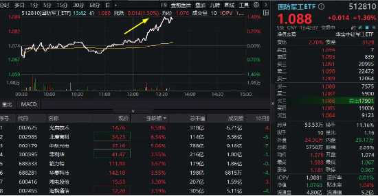 12月11日午后,早盘低迷盘整的国防军工板块突然发力,板块代表性国防军工ETF(512810)快速拉升,截至发稿场内价格涨1.3%!成份股方面,光启技术飙涨超9%,北摩高科涨超6%,中航光电涨超5%,菲利华、华泰科技、铂力特等多股涨超3%。