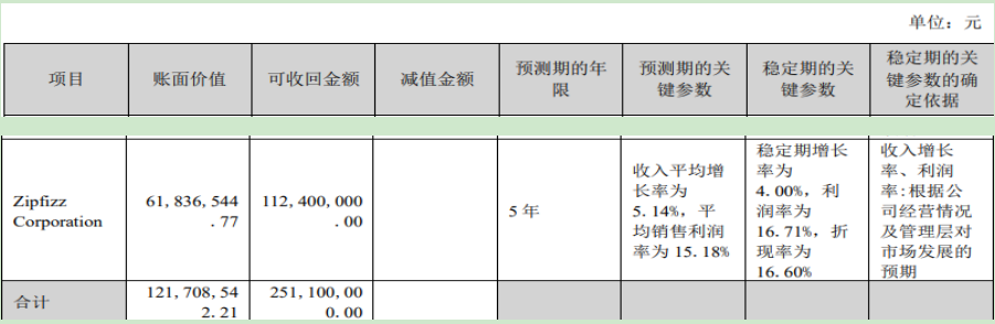 基于前次VB公司、诚信药业商誉全部减值的情况、不排除Zipfizz商誉减值带来的隐忧。