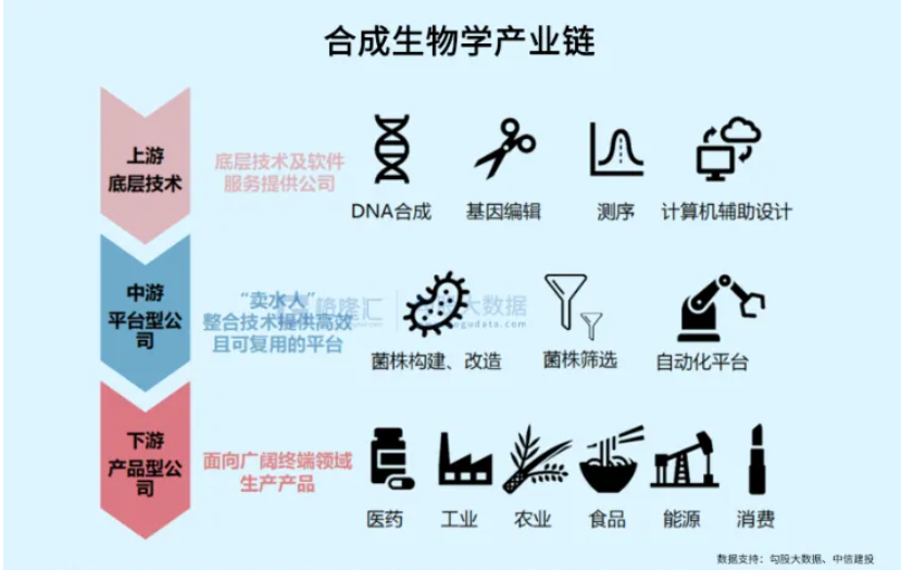 而且合成生物学产业链较长,涵盖上游底层技术、中游平台型公司、下游产品型公司,利用合成生物技术能够生产出从精细化工、食品、医美、医药等多领域的产品。