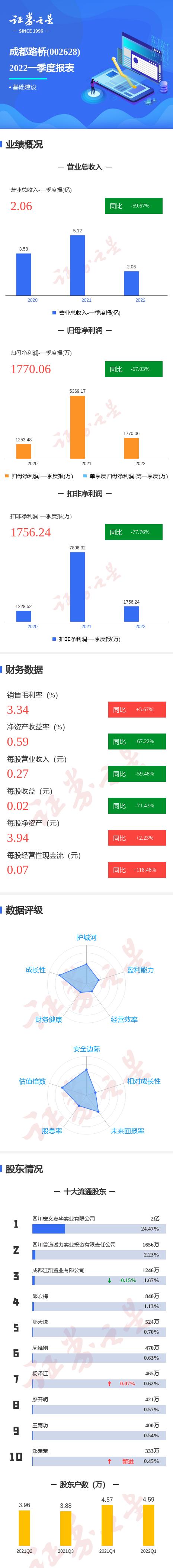 成都路桥2022一季报显示,公司主营收入2.07亿元,同比下降59.67%;归母净利润1770.06万元,同比下降67.03%;扣非净利润1756.25万元,同比下降77.76%;其中2022年第一季度,公司单季度主营收入2.07亿元,同比下降59.67%;单季度归母净利润1770.06万元,同比下降67.03%;单季度扣非净利润1756.25万元,同比下降77.76%;负债率59.91%,投资收益4910.83万元,财务费用3870.66万元,毛利率3.34%。