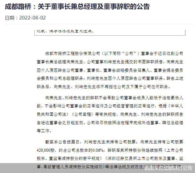 8月2日,成都路桥披露公告称,公司董事会于近日收到公司董事长兼总经理向荣提交的书面辞职报告,向荣因个人原因辞去公司董事、董事长、董事会战略委员会召集人、董事会提名委员会委员和公司总经理职务,辞去上述职务后,向荣将不再担任公司及下属子公司任何职务。