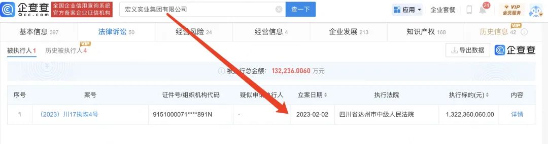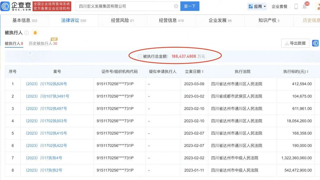 数据显示,宏义发因欠缴土地出让价款,被达州自然资源和规划局列入失信黑名单;目前,宏义发展还是8个案件的被执行人,被执行总金额达到18.84亿元;2023年2月2日,宏义集团被达州中级人民法院立案执行,被执行总金额为13.22亿元。