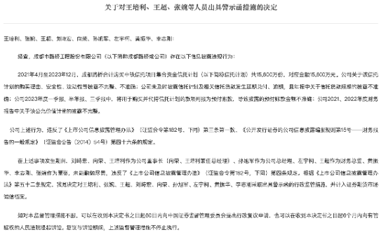 同时,针对成都路桥在信息披露中的违规行为,四川证监局还对包括王培利、王超、张婉等在内的九位高管采取了出具警示函的行政监管措施,并同样计入诚信档案。这些高管因未能勤勉尽责,违反了《上市公司信息披露管理办法》的相关规定,被予以警示。