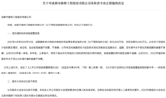 基于此,四川证监局决定对成都路桥采取责令改正的行政监管措施,并要求公司在收到决定书后30日内提交书面整改报告,全面整改上述问题,完善内部制度,强化流程管理和规则学习,防止类似问题再次发生。此外,该决定已计入证券期货市场诚信档案。