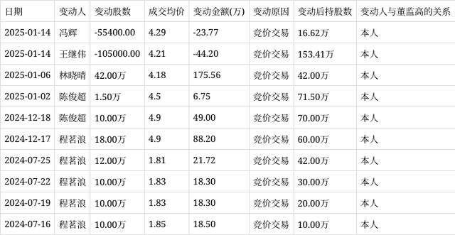 深交所公开信息显示,1月14日,成都路桥高管冯辉在竞价交易公司股票,减持股数5.54万股,成交均价4.29元,变动金额23.77万元,变动后持股数为16.62万股。