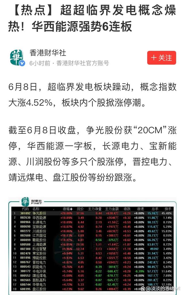 有可能st的华西能源撞了大运,给个支点就尽情发挥,三个换手涨停后又三个一字涨停,因超超临界发电多路游资把它捧上了龙头的位置。