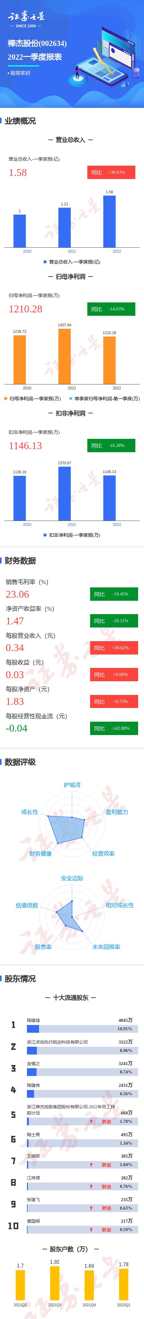 棒杰股份2022一季报显示,公司主营收入1.59亿元,同比上升30.63%;归母净利润1210.29万元,同比下降14.03%;扣非净利润1146.13万元,同比下降16.38%;其中2022年第一季度,公司单季度主营收入1.59亿元,同比上升30.63%;单季度归母净利润1210.29万元,同比下降14.03%;单季度扣非净利润1146.13万元,同比下降16.38%;负债率20.67%,投资收益179.28万元,财务费用93.88万元,毛利率23.06%。