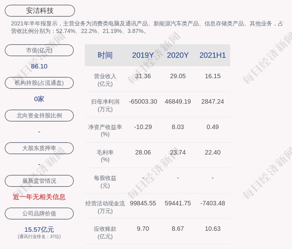 2021年半年报显示,安洁科技的主营业务为消费类电脑及通讯产品、新能源汽车类产品、信息存储类产品、其他业务,占营收比例分别为:52.74%、22.2%、21.19%、3.87%。