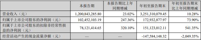 年初至报告期末,公司实现营业收入32.51亿元,同比增长10.28%;归属于上市公司股东的净利润1.73亿元,同比增长73.90%;扣除非经常性损益后的净利润1.51亿元,同比增长541.35%;经营活动产生的现金流量净额-1.48亿元。
