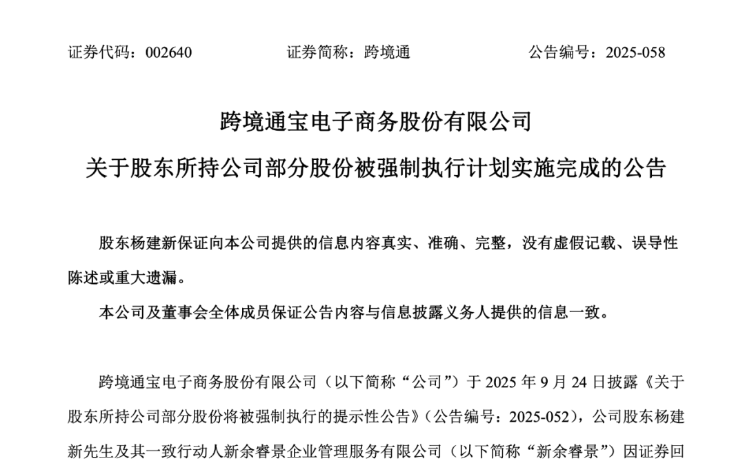 近日,跨境通宝电子商务股份有限公司发布公告,公司股东杨建新先生及其一致行动人新余睿景企业管理服务有限公司因证券回购合同纠纷引发的股份强制执行计划已实施完毕。