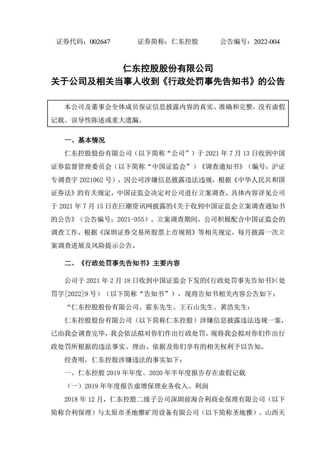 2020年最高疯涨近4倍的“前大牛股”仁东控股(002647,SZ)的财务造假案终于迎来了后续!2月21日晚间,仁东控股发布公告称,公司收到中国证监会下发的《行政处罚事先告知书》(以下简称“《告知书》”)。《告知书》显示,证监会拟对仁东控股、时任董事长霍东、副总经理黄浩、财务总监王石山合计处罚320万。