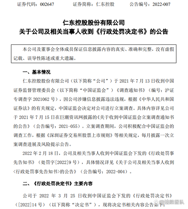 2022年3月27日晚,仁东控股(002647)公告收到证监会下达的罚单,仁东控股被行政处罚150万元,相关责任人共计被罚220万元。处罚书内容与此前下发的预告书内容一致,公司2019、2020年半年度报告存在虚假记载以及未按规定及时披露未能清偿到期重大债务的违约情况构成违法行为。