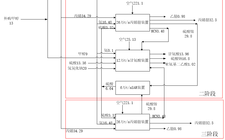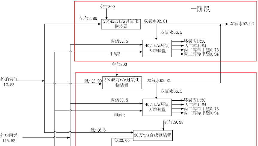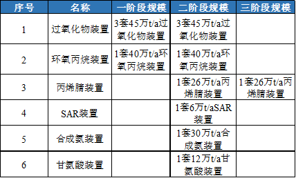 本项目分三个阶段实施,一阶段主要生产装置包括1#环氧丙烷装置、1#—3#过氧化物装置;二阶段主要装置包括2#环氧丙烷装置、4#—6#过氧化物装置、1#丙烯腈装置、SAR装置、合成氨装置、甘氨酸装置;三阶段主要装置为2#丙烯腈装置。
