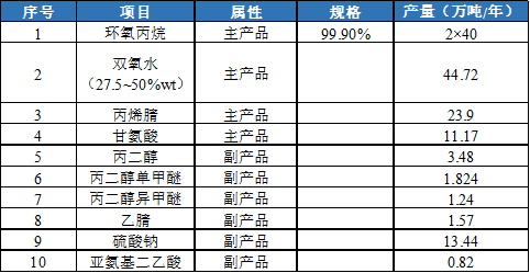 包括40万t/a环氧丙烷装置1套,主要产品为环氧丙烷40万t/a,副产品丙二醇1.472万t/a、丙二醇单甲醚0.584万t/a、丙二醇异甲醚0.752万t/a。