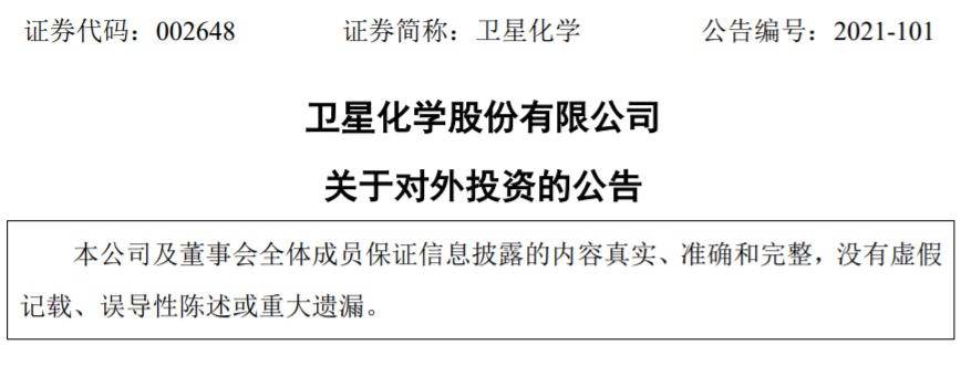 另外,在12月30日,卫星石化发布关于对外投资的公告。公告的主要内容如下: