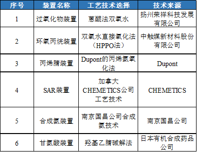 项目中的PO装置以外购丙烯为原料,利用连云港石化产业基地内副产氢气,通过双氧水直接氧化法生产环氧丙烷,双氧水由配套的双氧水装置制备;丙烯腈装置以外购乙烯为原料,通过丙烯氨氧化法生产丙烯腈,原料氨来自合成氨装置;丙烯腈装置副产的氢氰酸(HCN)作为甘氨酸装置的原料用于生产甘氨酸。