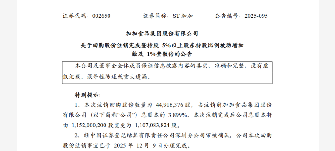 2025年12月10日,这项操作尘埃落定。 ST加加 公告完成4491.64万股回购股份注销,占注销前总股本的3.899%。本次注销完成后,公司总股本缩减至11.07亿股。值得注意的是,本次所注销的股份,正是三年前回购完成、原计划用于实施股权激励的股份。这部分股份一度深套超60%,然而随着股价大幅上涨,在注销时已实现较大盈利。这场从“深套”到“盈利退出”的筹码游戏,在改变公司资本结构的同时,也为控制权格局的演变写下了关键的注脚。